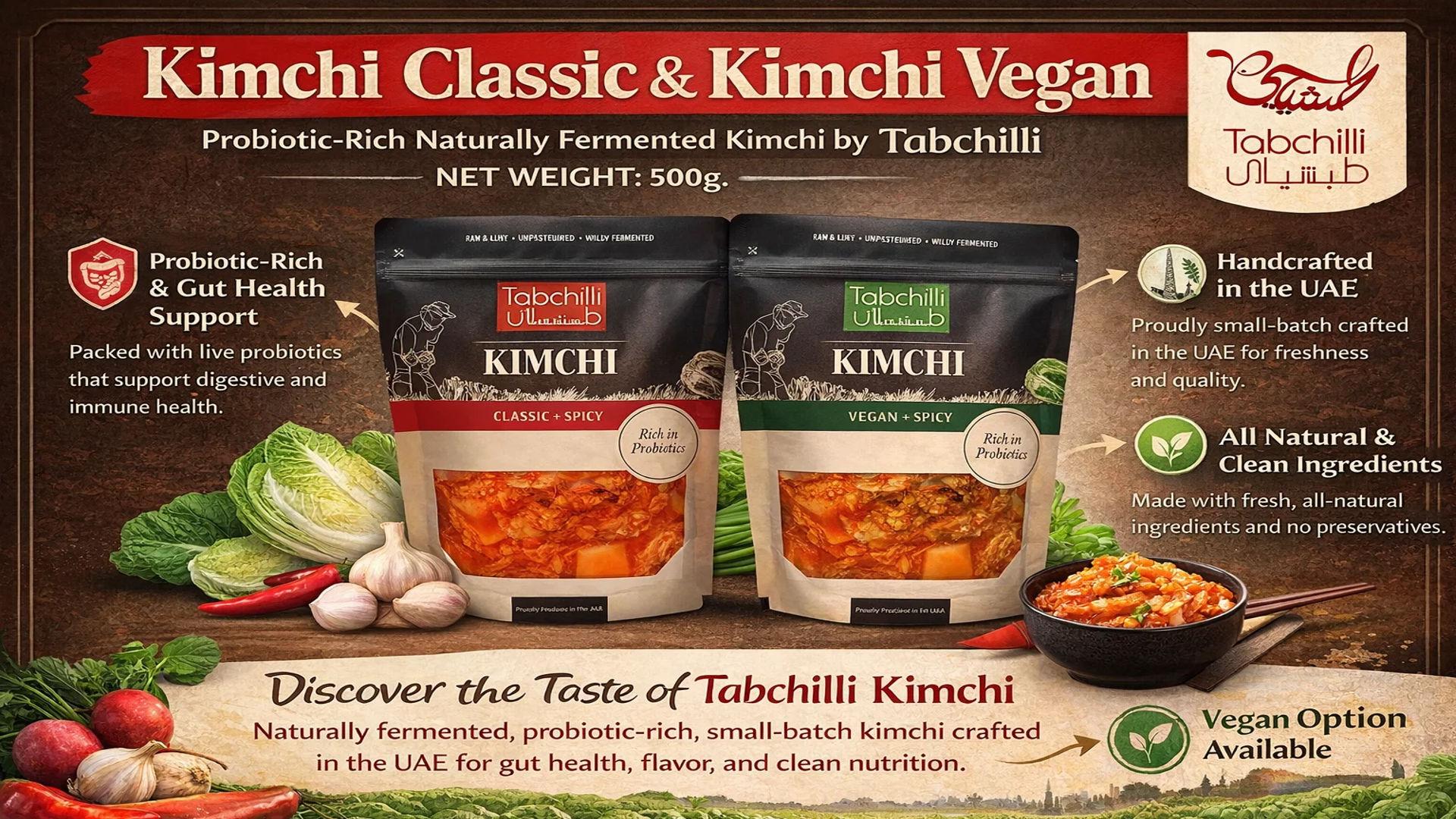 Discover Kimchi Classic and Kimchi Vegan by Tabchilli – naturally fermented, probiotic-rich, small-batch kimchi crafted in the UAE for gut health, flavor, and clean nutrition.