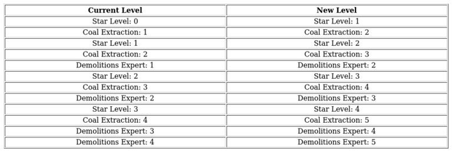 His expertise in demolition increases city coal mine output by up to 25% at max level.