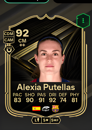 Introducing the formidable Team of the Week card for Alexia Putellas Segura, a 92-rated Center Midfielder who commands the pitch with her elite attributes. Boasting a remarkable 90 shooting, 91 passing, and 92 dribbling, she is complemented by solid pace (83) and physicality (81), alongside a reliable 74 in defense. As a central orchestrator, her exceptional passing and dribbling allow her to dictate the tempo, effortlessly slicing through midfield lines to create scoring opportunities, while her lethal shooting ensures she can decisively finish attacks and seal victories from the heart of the park.