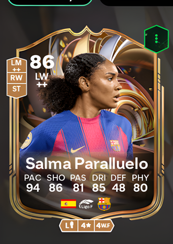 Salma Celeste Paralluelo Ayingono’s Ratings Reload card stands out as an electrifying Left Wing option, boasting an impressive overall rating of 86. With a blistering pace of 94, sharp shooting at 86, and agile dribbling rated 85, this card is designed for players who thrive on relentless attacking play. The solid passing rating of 81 ensures smooth link-up with teammates, while her physicality at 80 provides the strength needed to hold off defenders. As a winger, Salma’s card excels at breaking down opposition defenses with speed and precision, making her a constant threat on the flank and a game-changer capable of seizing crucial scoring opportunities.